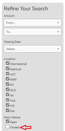 - To include Closed Grants in your search results, tick Closed under Grant Status in the Refine Your Search area