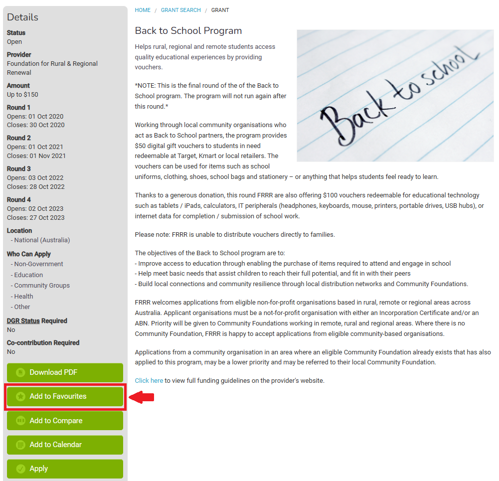 - You can also click Add to Favourites on the left-hand side of any grant listing to do the same thing.
